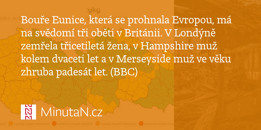 Atlantická bouře eunice udeřila na západní evropu s místy rekordními poryvy větru. V anglii zahynuli tři lidé v automobilu, v irsku jeden muž zemřel při odklízení následků bouře, když se na něj zřítil strom, a v nizozemsku . Dosahovala rychlosti až 196 kilometrů v . Děsivá bouře eunice klepe na dveře česka. V londýně zemřela třicetiletá žena, v hampshire muž kolem .